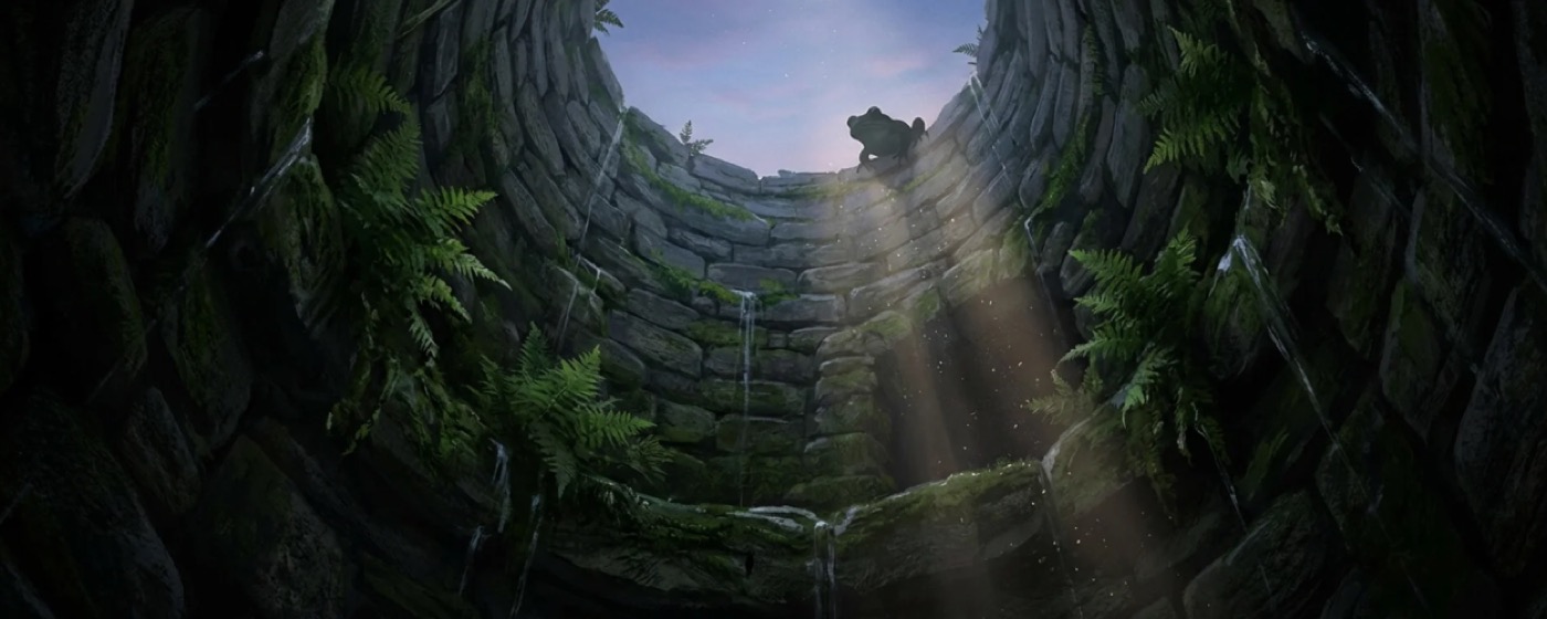 Once upon a time, there lived a young frog at the bottom of a well. He'd been there his whole life, quite comfortable, looking up at a very small patch of sky. His cousin came to visit from the outside and asked why he'd never left. "The sky is so small," said the frog. "There's nothing out there for me." His cousin pleaded until he finally climbed up. At the midway point, the sky broadened. He grew fascinated and nervous. At the top, he was speechless. Trees, meadows, a beautiful pond. "I never knew how much beauty existed outside of the well."